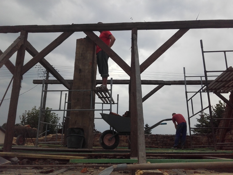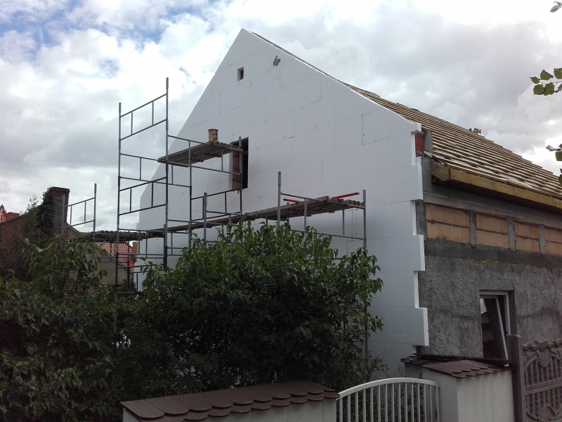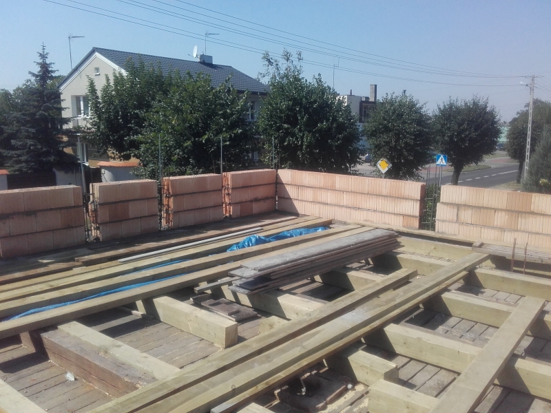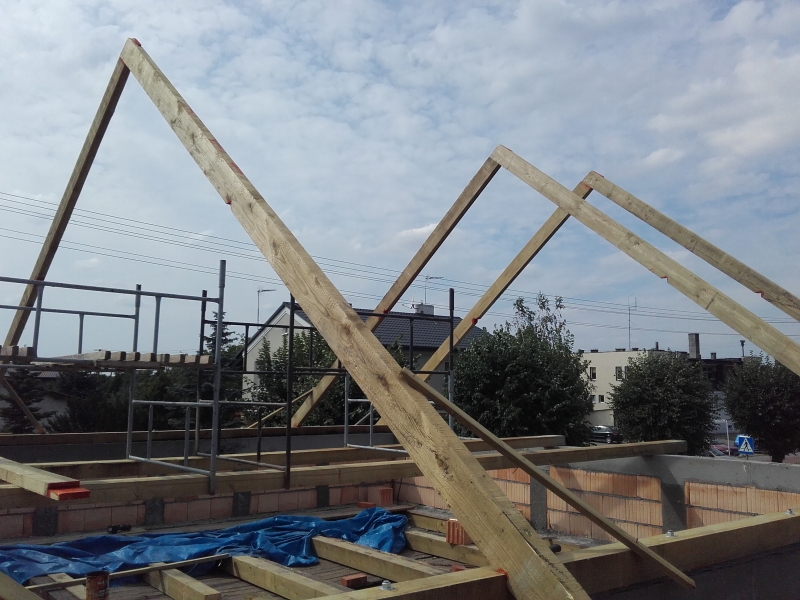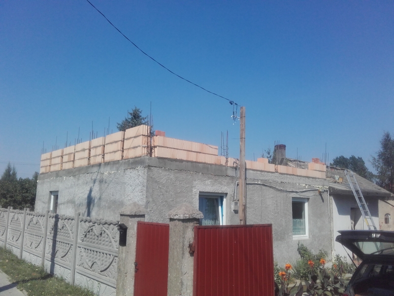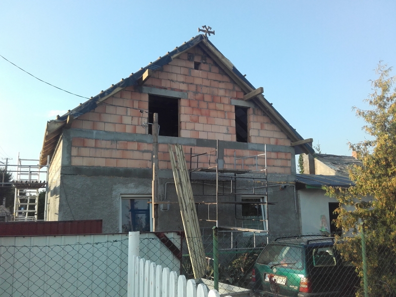 Demontaż wcześniejszego pokrycia dachowego oraz więźby dachowej, montaż belek sufitowych, murowanie ścian kolankowych, wieńce, więźba dachowa, pokrycie blacho-dachówka, system rynnowy, podbitki, docieplanie ścian.