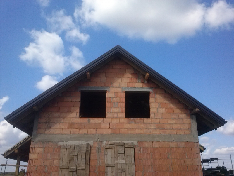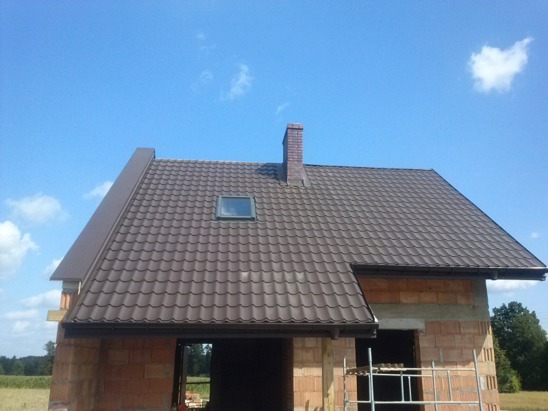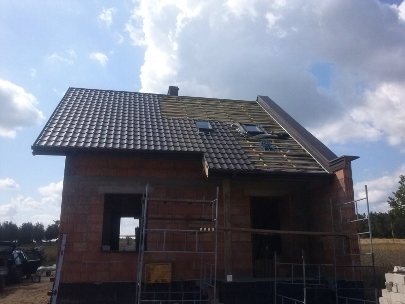 Montaż więźby dachowej, Pokrycie blacho-dachówka, system rynnowy, ognio-mur.