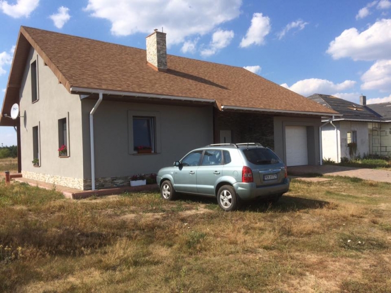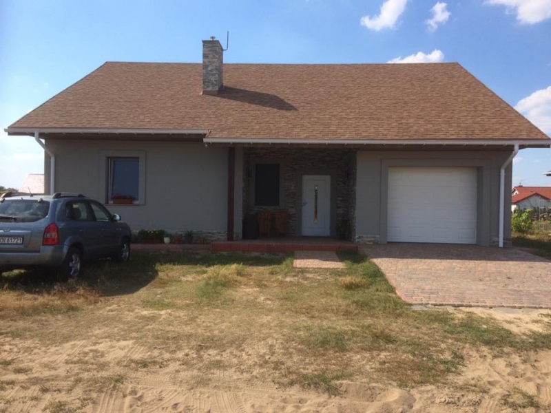 Przy tej inwestycji inwestor zdecydował się na pokrycie dachu gontem bitumicznym. Całość budynku idealnie podkreślił biały system rynnowy.